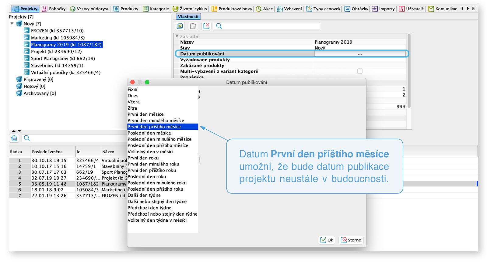 Ve vlastnostech projektu můžete místo fixního data nastavit, aby bylo datum publikování projektu neustále např. první den příštího měsíce.
