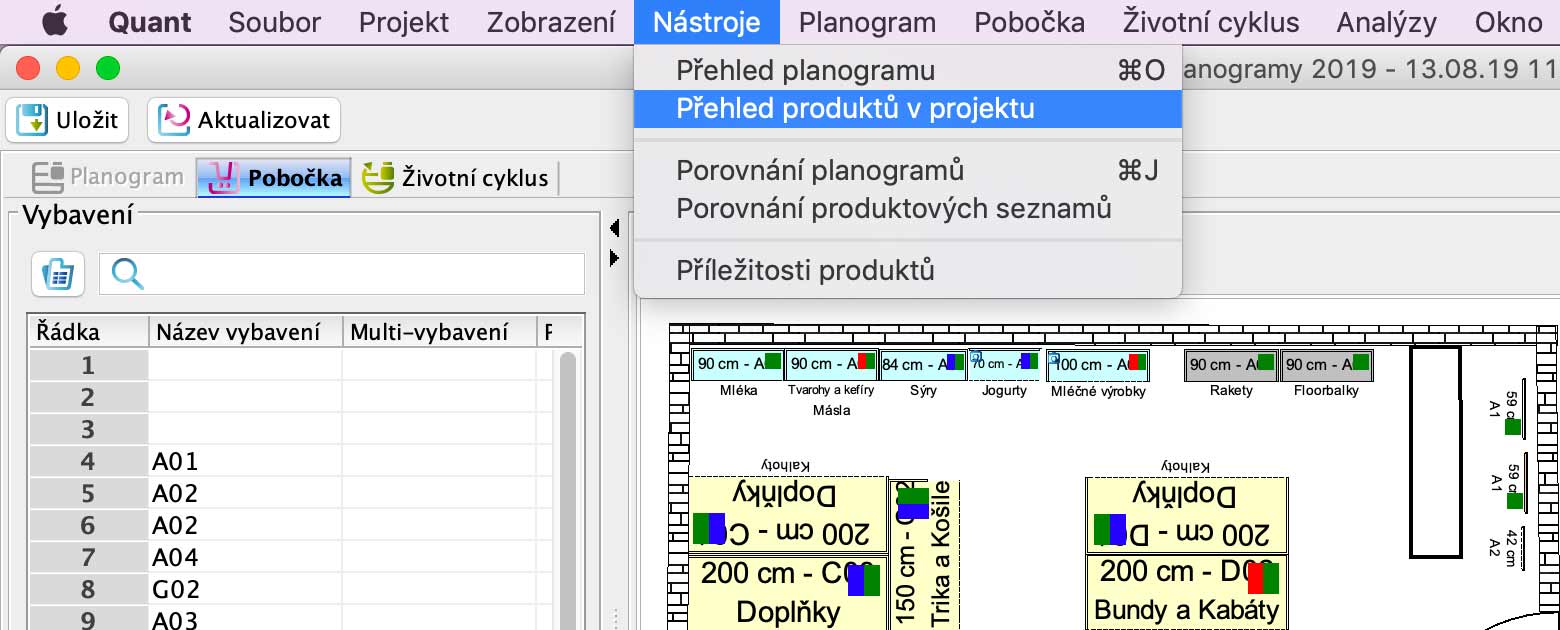 1. V Editoru projektu klikněte na záložku Nástroje a vyberte možnost Přehled produktů v projektu.