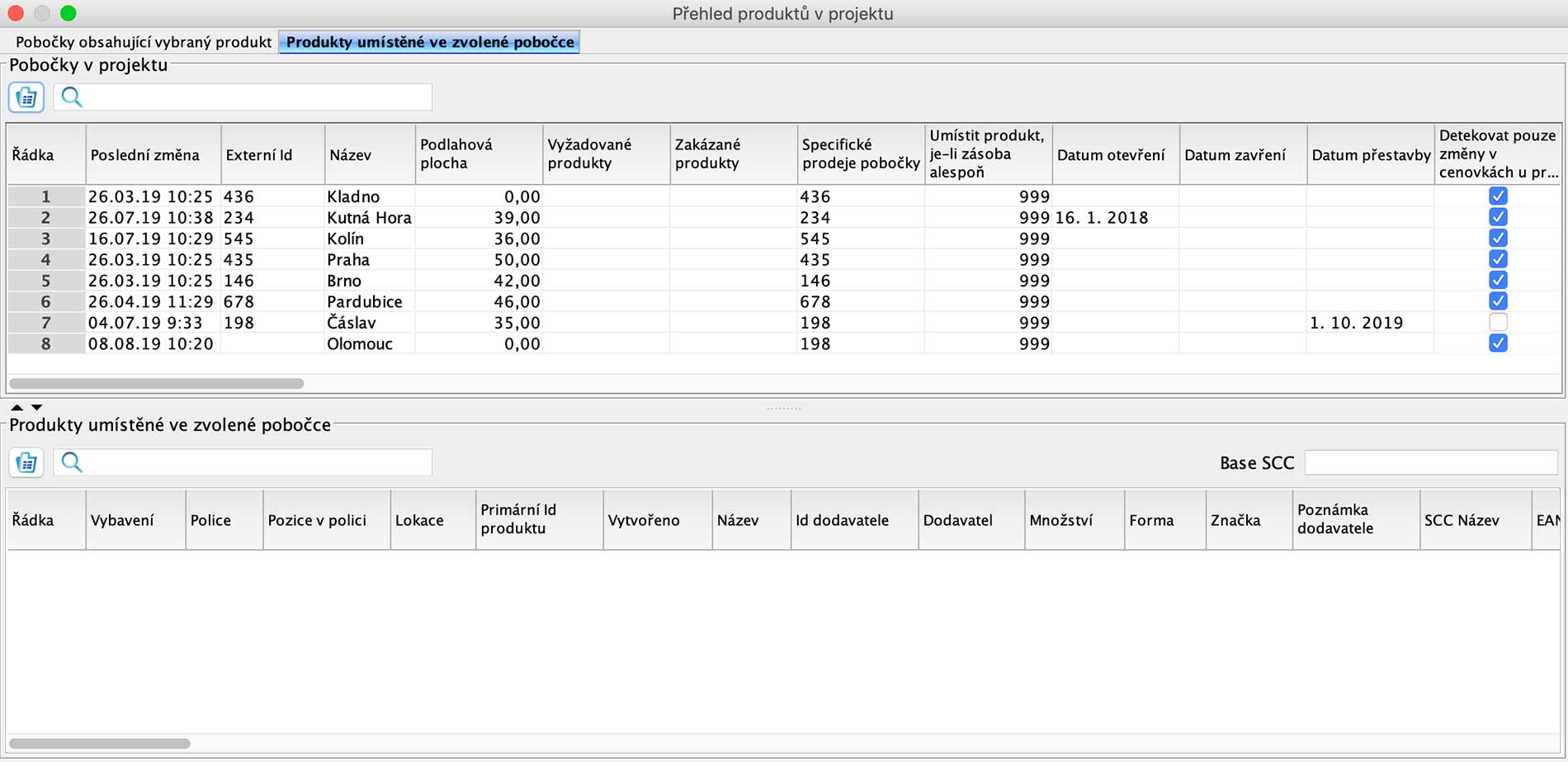 2. V zobrazeném okně přejděte na záložku Produkty umístěné ve zvolené pobočce.