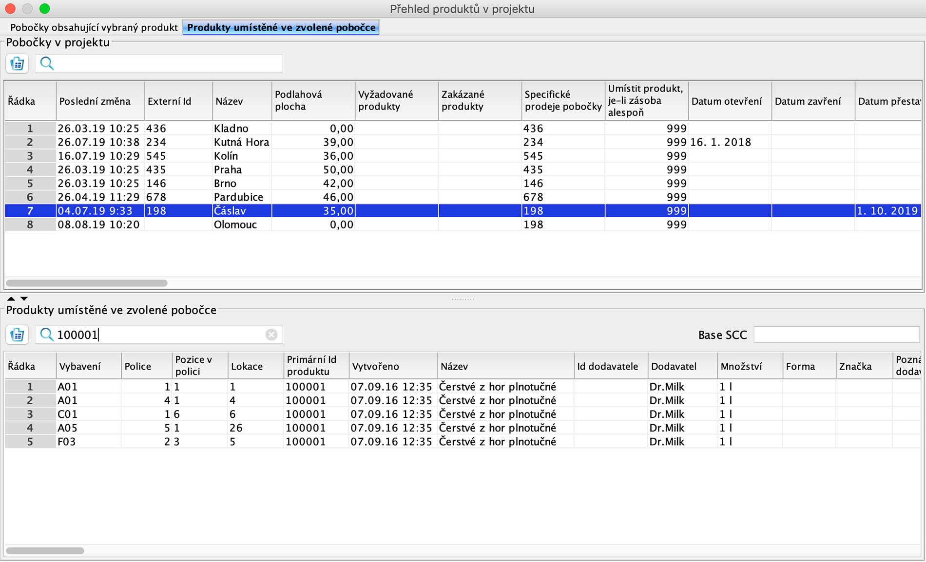 3. V horní tabulce zvolte pobočku, která Vás zajímá (v našem případě pobočka Čáslav). Ve spodní tabulce se Vám zobrazí všechny produkty umístěné na této pobočce.