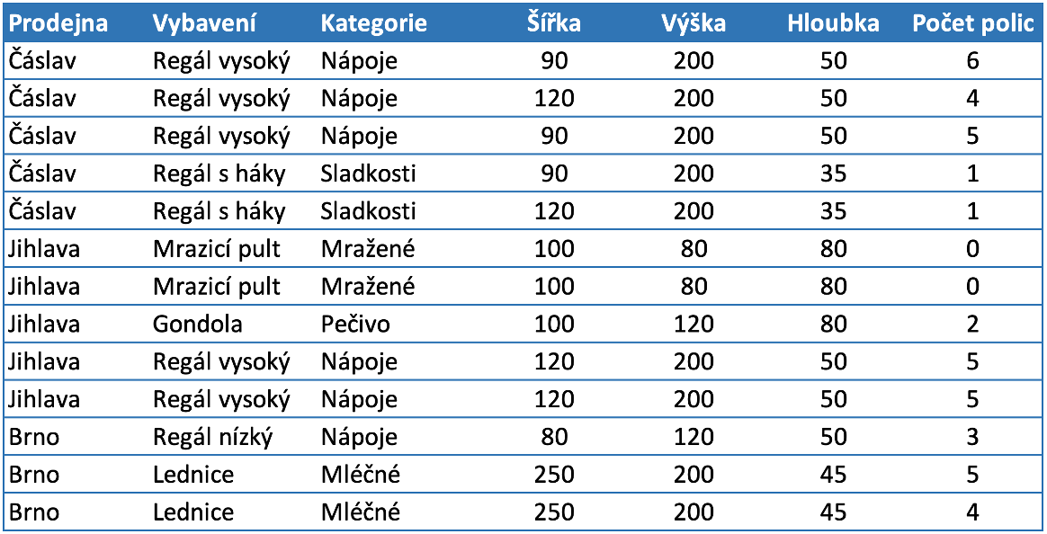 Vznikne tabulka podobná této, kde jedna řádka odpovídá jednomu vybavení na prodejně a sloupce reprezentují údaje jako jsou rozměry, kategorie, nebo třeba materiál.