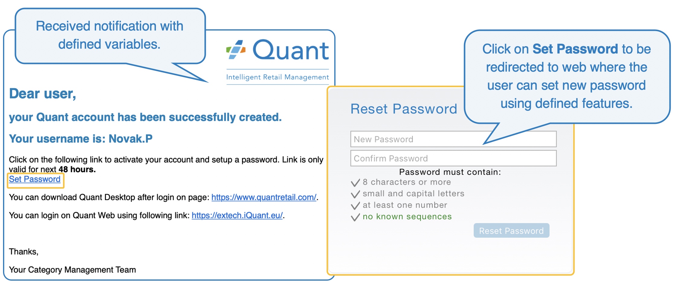 When a new user is created in Quant, an e-mail notification is sent with his/her username and a link where a password can be set.