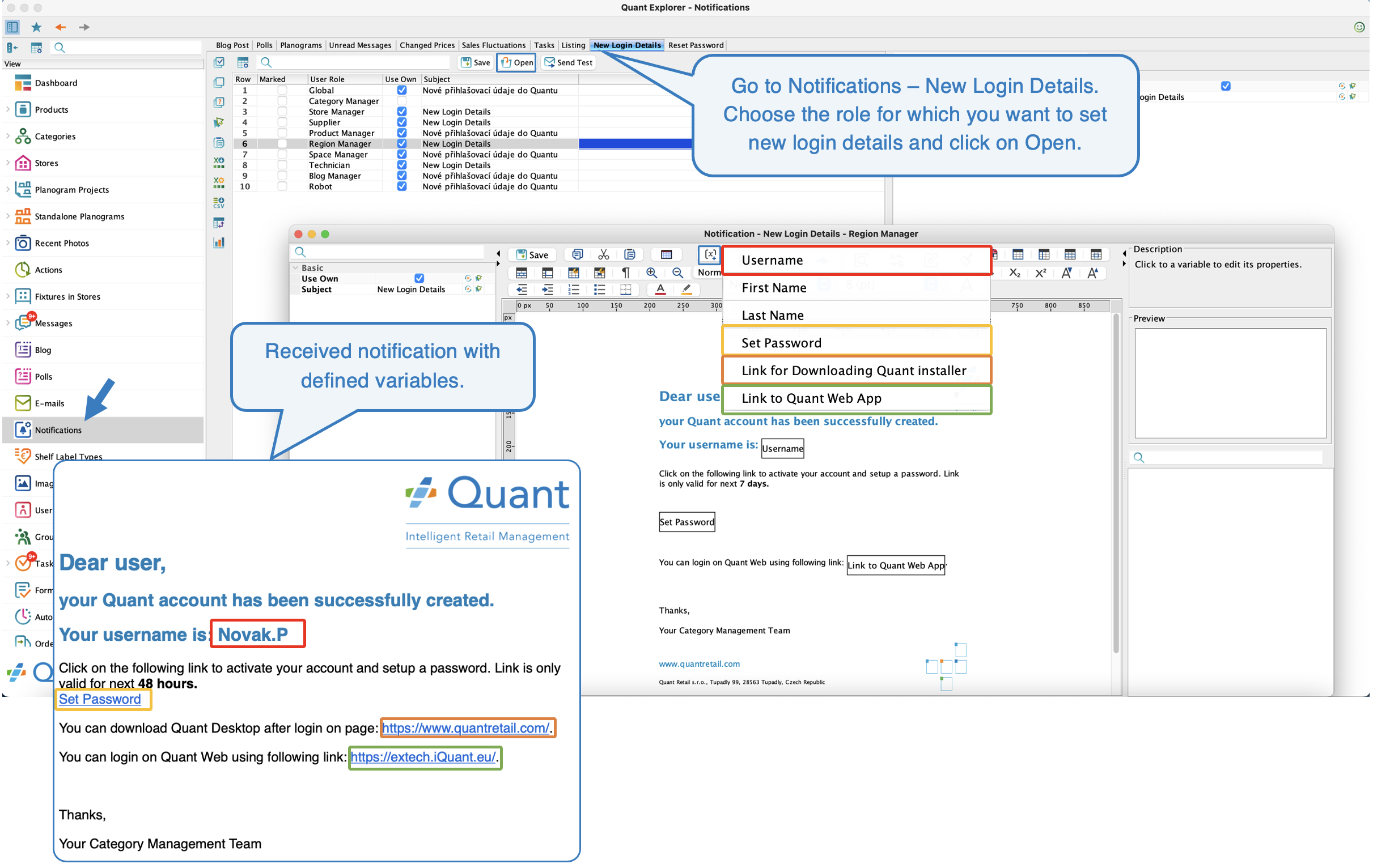You only need to include the Link for Downloading Quant installer variable for user roles which have access to the Desktop application. For example, Store Managers should not have this variable included in the notification at all.